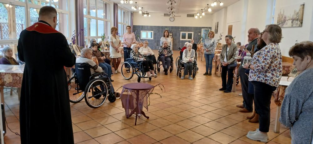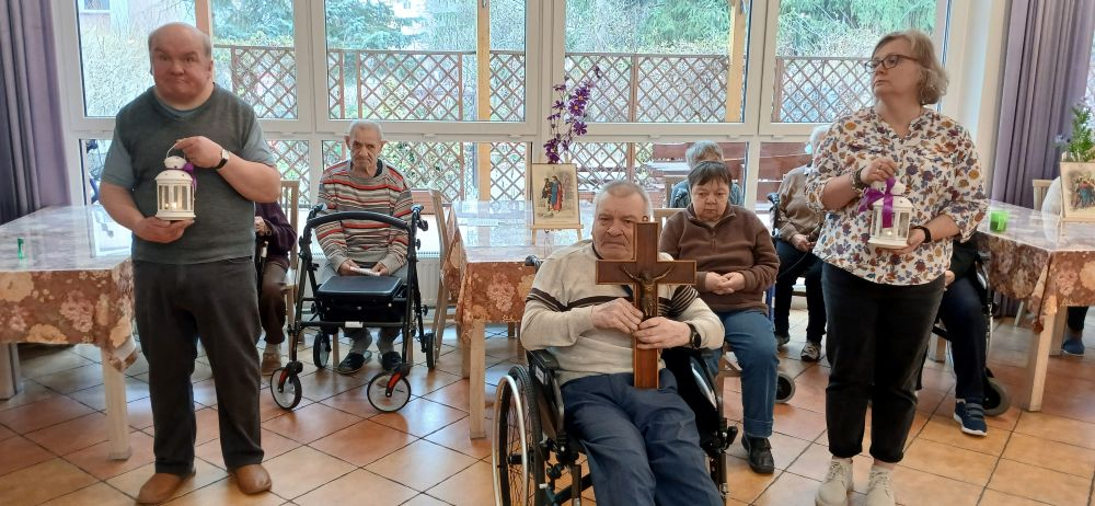 20 marca, jak co roku w Wielkim Poście, odbyła się w naszym Domu, uroczysta Droga Krzyżowa, w której udział brali Mieszkańcy i Pracownicy. Spotkaliśmy się w jadalni, gdzie ustawione zostały poszczególne Stacje DK. Chętni nieśli Krzyż podczas poszczególnych Stacji, a rozważania DK, wygłoszone zostały przez posługującego nam Księdza Jarosława. Nasze modlitewne spotkanie było ogromnie wzruszające i pełne refleksji.
