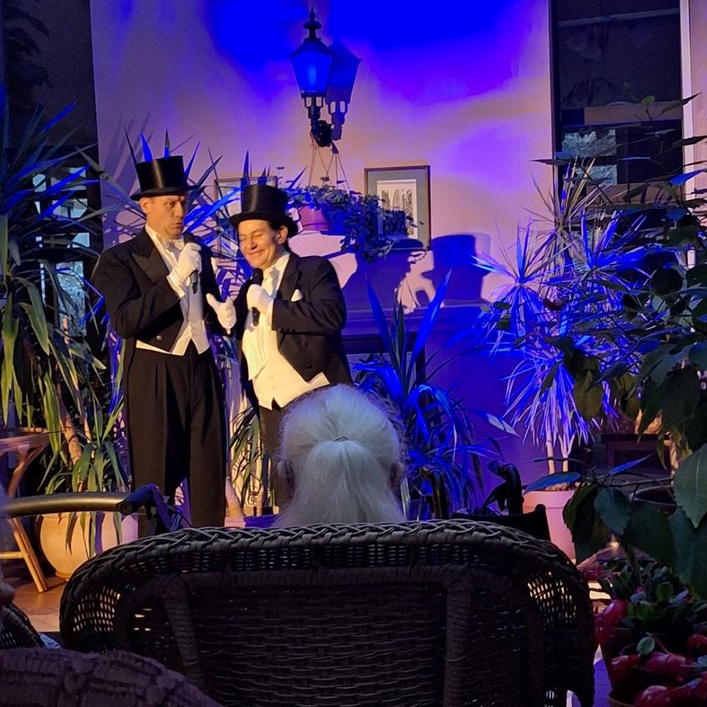 23 listopada odbył się w naszym Domu, kolejny koncert wspaniałych Artystów z Muzycznego Teatru Wędrownego Maggie Tunkiewicz – Zakrzewskiej. Tym razem koncert zorganizowany został w naszym zielonym patio. Rośliny, które tam rosną stworzyły naturalną scenografię dla pięknych piosenek, które znamy z filmów oglądanych na małych i dużych ekranach oraz dla niezwykłych i eleganckich strojów, w których wystąpili Artyści. „Ach jak przyjemnie” było słuchać a nawet wtórować do znanych i lubianych utworów. Nasi Goście przenieśli nas w czasie i miejscu, bowiem mogliśmy się poczuć tak, jak byśmy byli widzami Teatru Wielkiego. Piękna oprawa, wspaniałe wykonanie – majstersztyk!